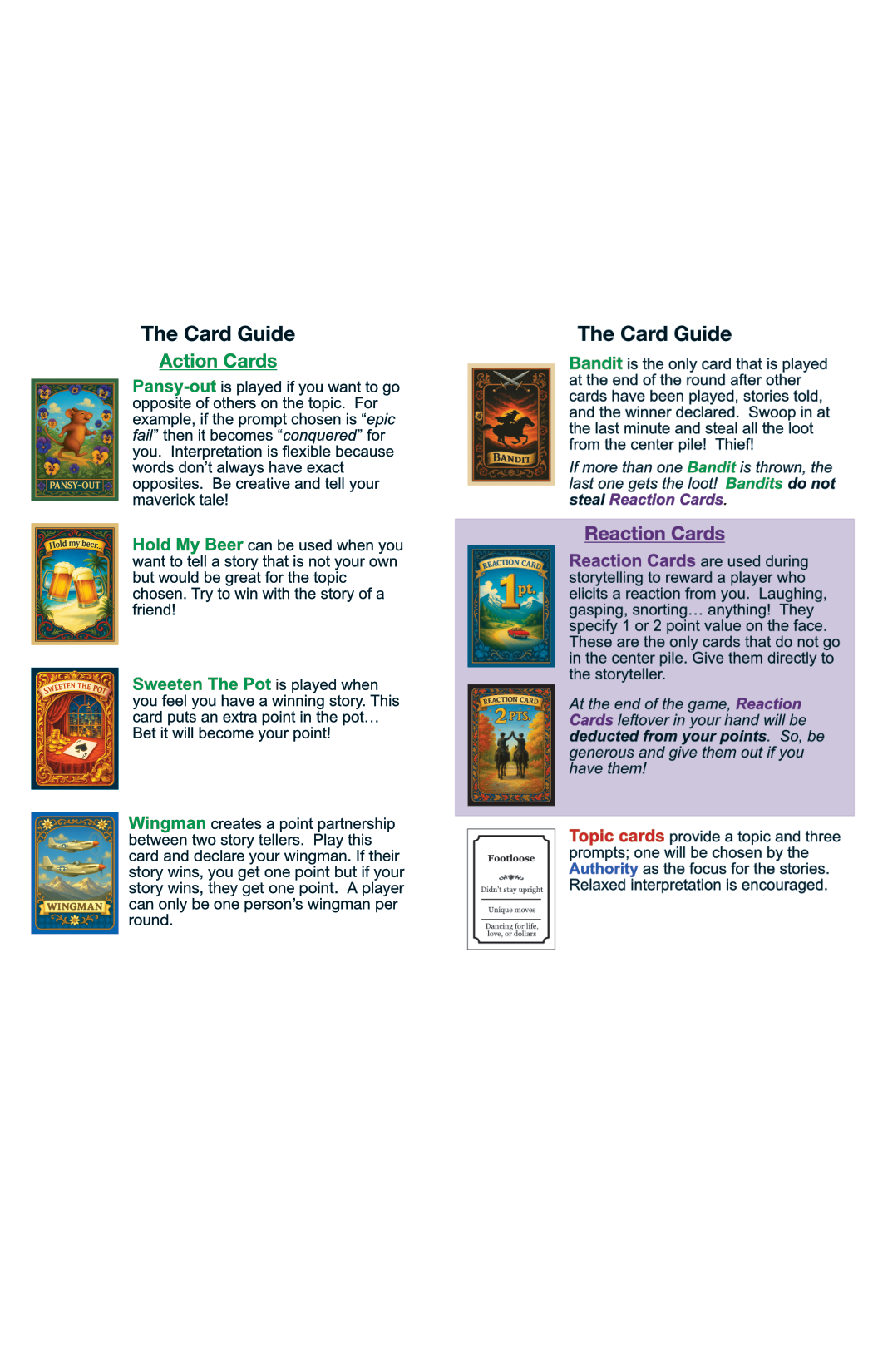 - HOW TO PLAY: Earn points by bringing memories back to life in stories inspired by the Topic Card. Use the cards in your hand to add strategic twists to turn the topic and points to your favor. Tell your tale with flair and finesse, because other players can throw Reaction Cards at you while you are storytelling. One player, “The Authority,” picks their favorite storyteller, and that player scoops up the pile of cards for points.